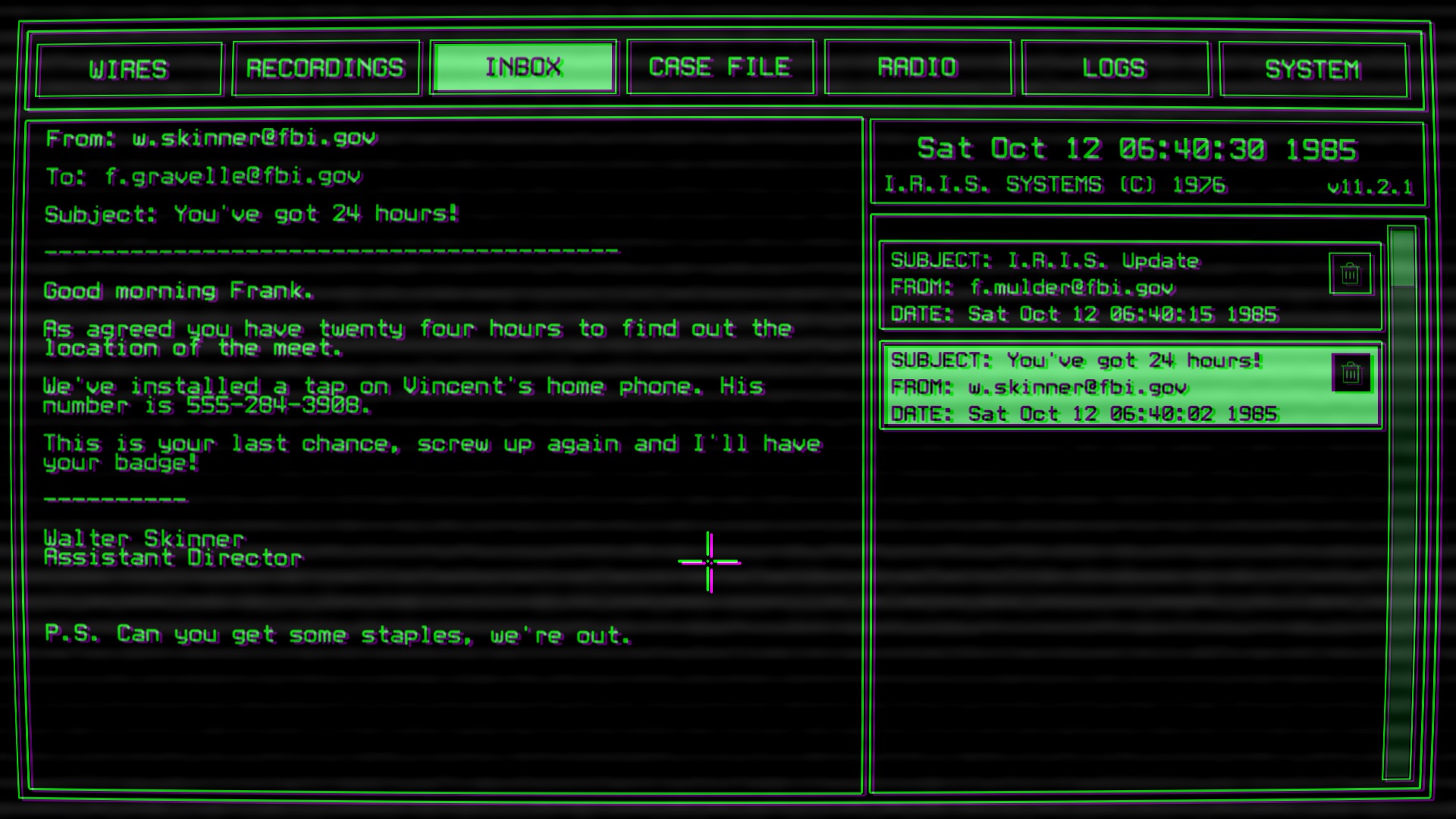 Eavesdrop on the lives of others from across the street in your rear windowless van - trace calls, decipher codenames, listen to teenage dramas, plant bugs, decrypt communications, and exploit mobsters - all to keep track of the Baritone family and catch a killer.